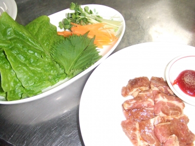 肉を食べるなら野菜と一緒に〜それが嬉しいラムギョプサル。りんごやオレンジを使ったフルーティーなタレにつけ込んだラム肩ロースを網で焼いて、お好みの野菜と一緒にサンチュで巻いて、召し上がってください。